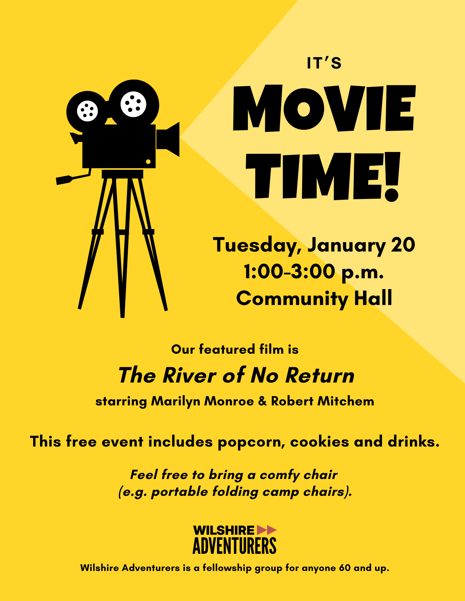 The Wilshire Adventurers will enjoy an afternoon movie on Tuesday, Jan. 20, from 1 to 3 p.m. in Community Hall. This free event includes popcorn, cookies, drinks and a screening of The River of No Return, starring Marilyn Monroe and Robert Mitchum.