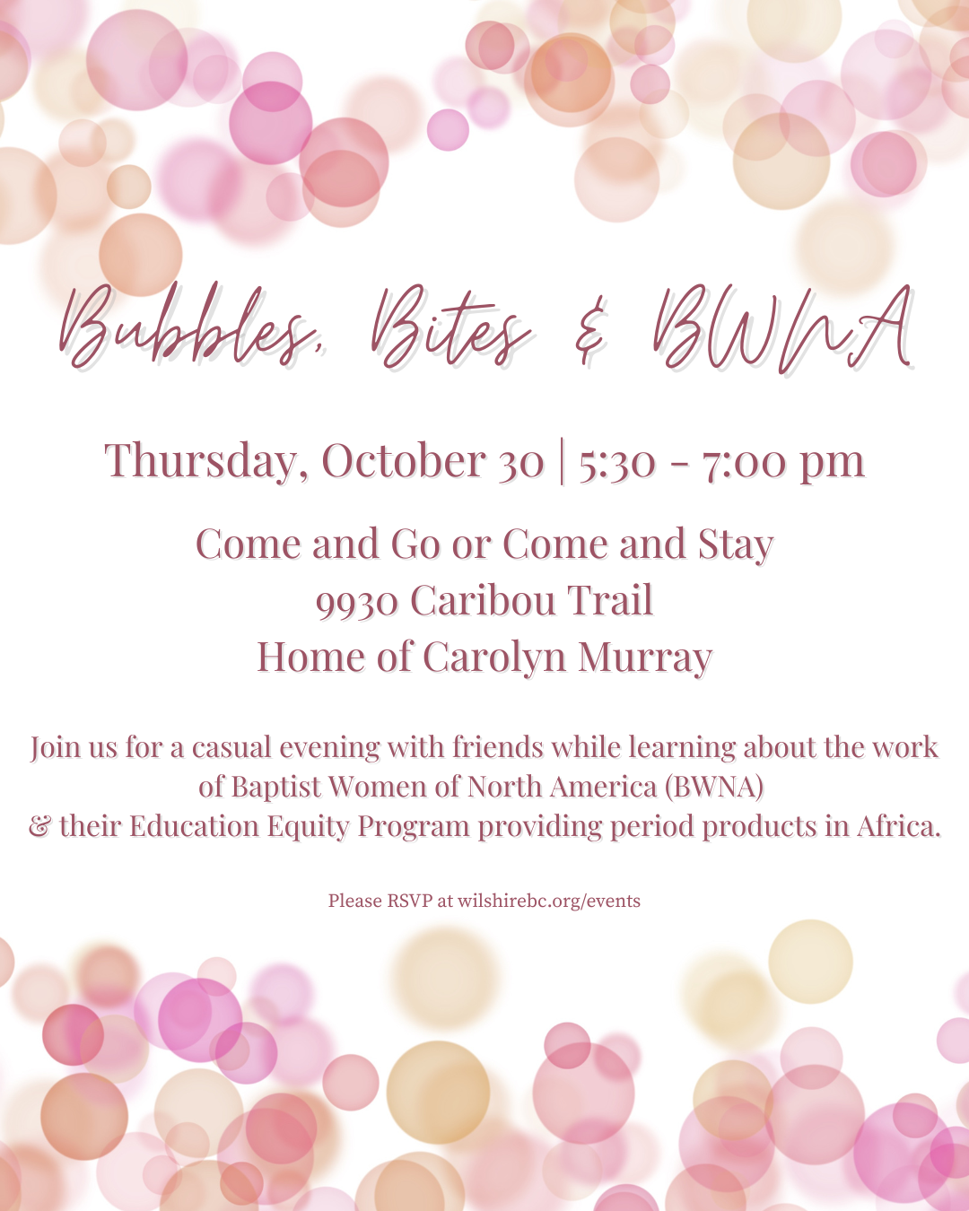 Join Women of Wilshire for a casual evening with friends while learning about the work of Baptist Women of North America (BWNA) and their Education Equity Program, which provides period products in Africa.
