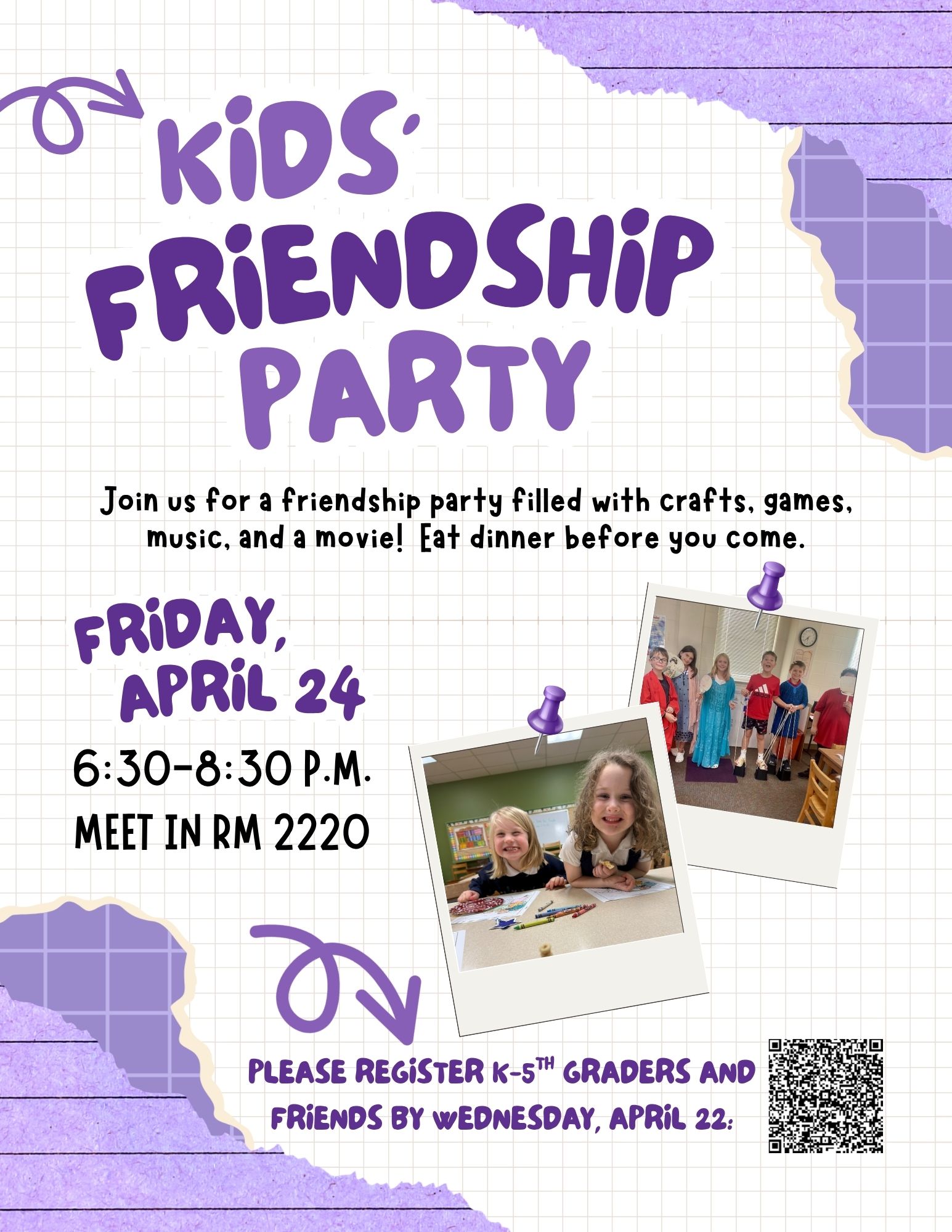 Children in kindergarten through grade 5 are invited to a party with crafts, games, music and a movie on Friday, April 24, from 6:30 to 8:30 p.m. Friends are welcome. Please register Wilshire kids and friends by April 22.