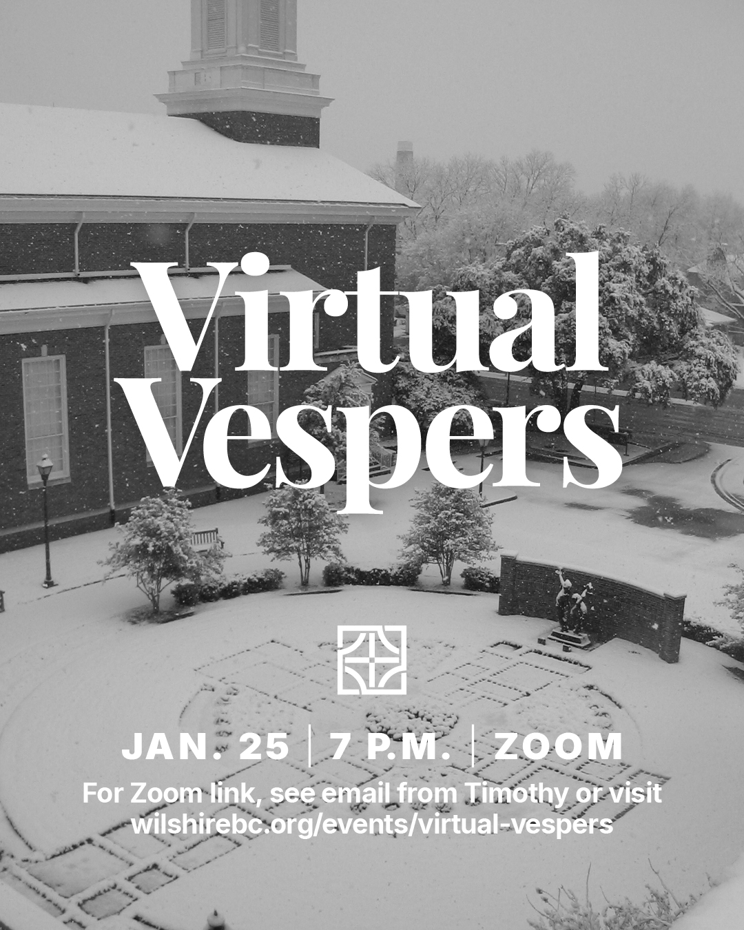 This evening, we invite you to join us for a Zoom Vespers Service at 7:00 pm CT. This contemplative time of worship will include prayer, scripture, music, and a moment of reflection amid uncertainty.